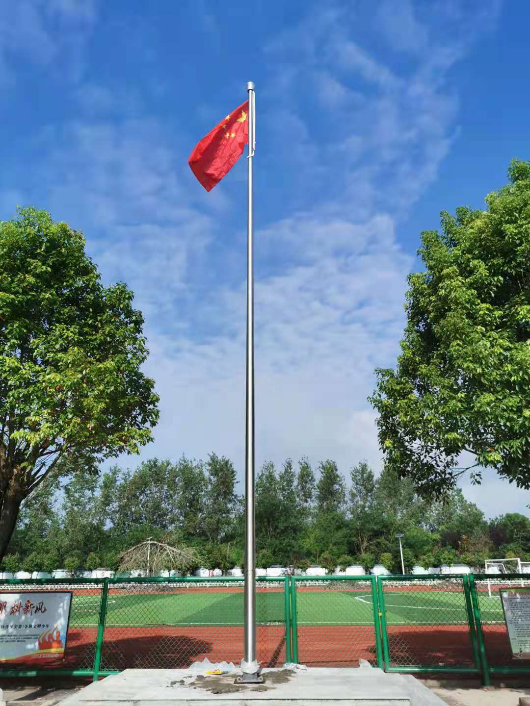 六安市裕安區順河初級中學1支12.8米錐形旗桿,此次左尚金屬安徽耀龍為六安市裕安區順河初級中學生產的旗桿為優質不銹鋼制造,旗桿錐形挺拔高大,是錐形外置式的旗桿,內藏不銹鋼繩,旗桿外無旗繩,免去旗桿與旗繩碰撞產生刮痕,從而可能導致桿體易生銹。