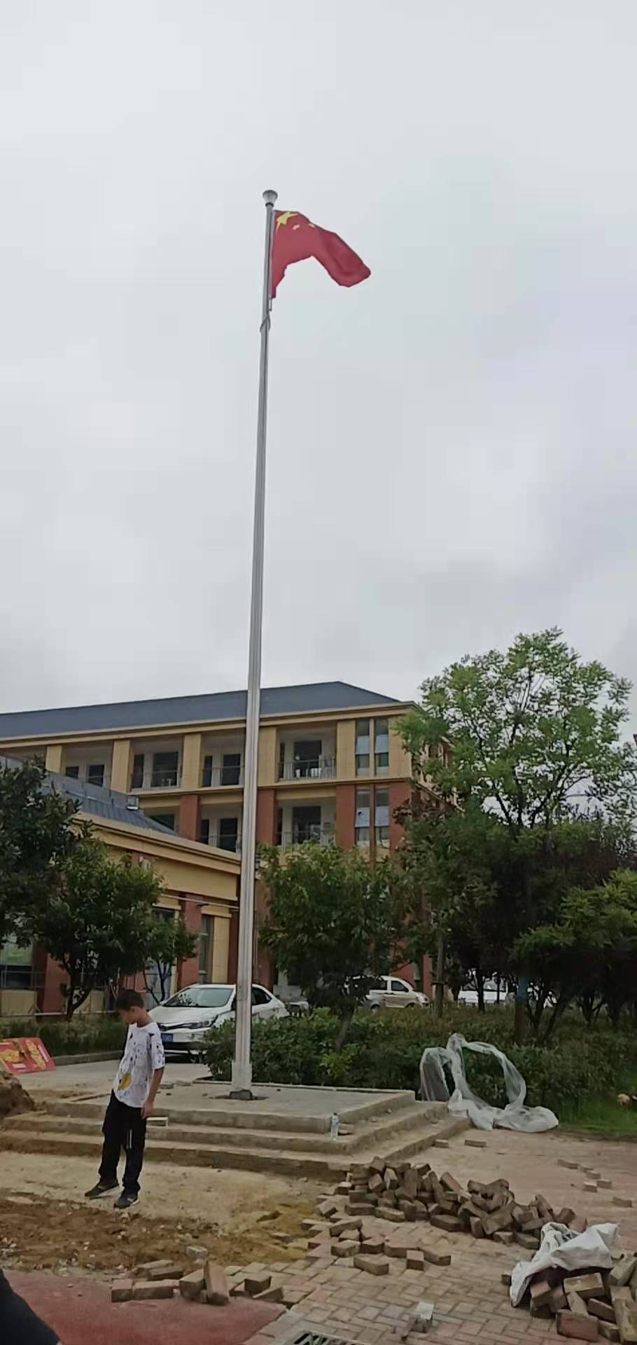 六安市解放路第三小學安裝1支12米電動錐形旗桿,此次左尚金屬安徽耀龍為六安市解放路第三小學生產的旗桿為優質不銹鋼制造,旗桿錐形挺拔高大,是錐形外置式的旗桿,內藏不銹鋼繩,旗桿外無旗繩,免去旗桿與旗繩碰撞產生刮痕,從而可能導致桿體易生銹。